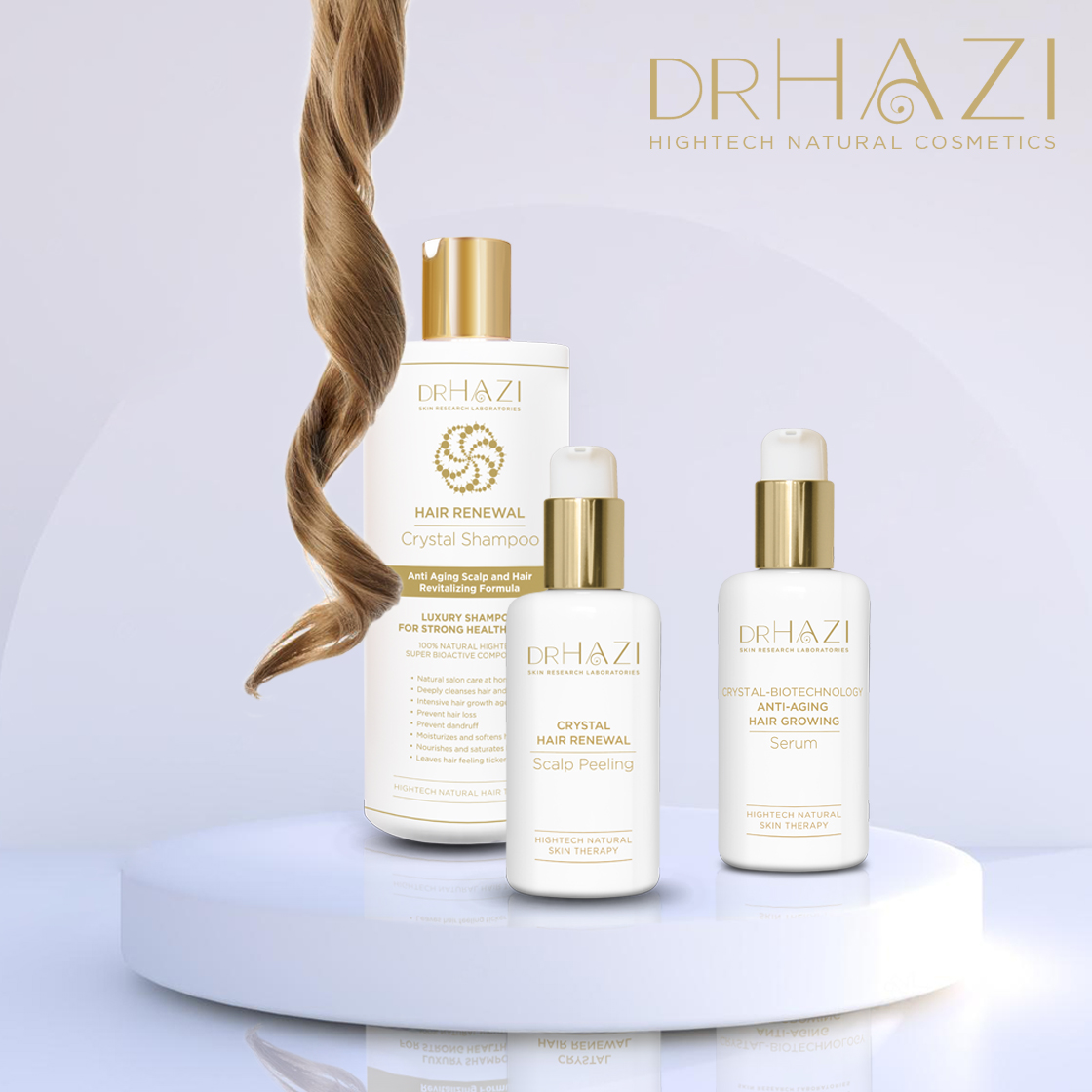 DRHAZI Hair Renewal Shampoo with Crystal-biotechnology combines traditional plant extracts with the latest biotechnological active ingredients, developed using scientific methods. The excellent care ingredients are enhanced by substances that promote hair renewal, growth, and offer antimicrobial, anti-inflammatory, and pore-tightening effects. The hair bulb and anchorage system are significantly strengthened, supporting healthier and stronger hair.